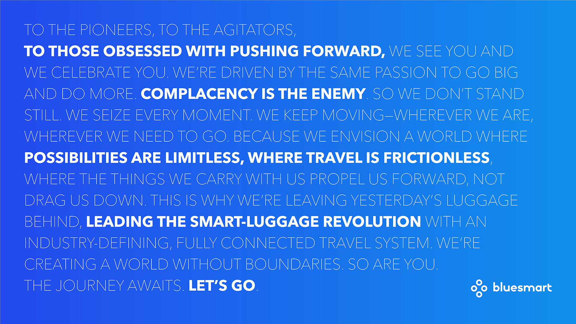 Reinventing the brand that invented smart-luggage. Bluesmart was launching Series 2, the next evolution in tech- infused luggage. They needed help defining the foundational brand position for the company. Working closely with the Bluesmart leadership at this pivotal moment, we developed an insight-driven positioning complete with a new tagline, manifesto, brand positioning statement, key messages, style guide and visual direction.