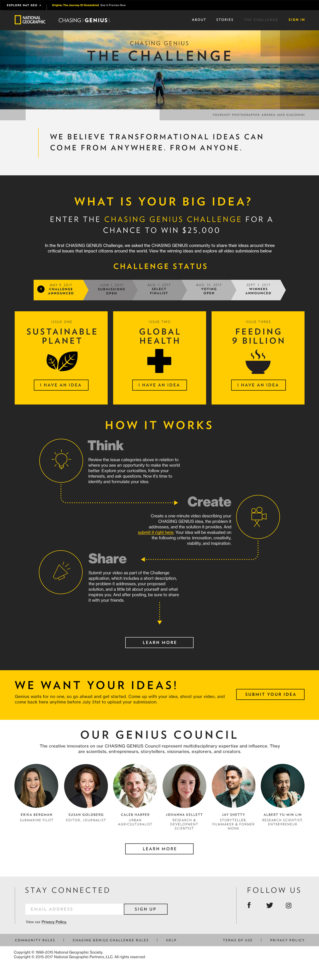 A campaign to engage the creative class, through crowdsourcing genius ideas. Under my creative direction and in partnership with Artemis Ward, I led the design and visual strategy for the development of a responsive product platform and campaign creative for National Geographic’s Chasing Genius challenge. A digital campaign developed to cultivate best-in-class ideas from around the world on environmental sustainability, global health, and feeding a growing a population.